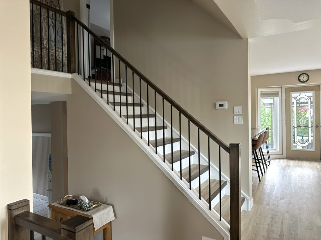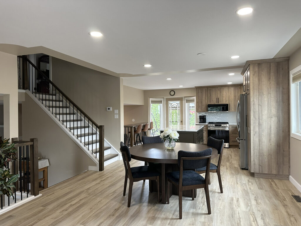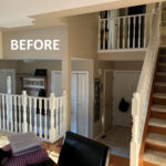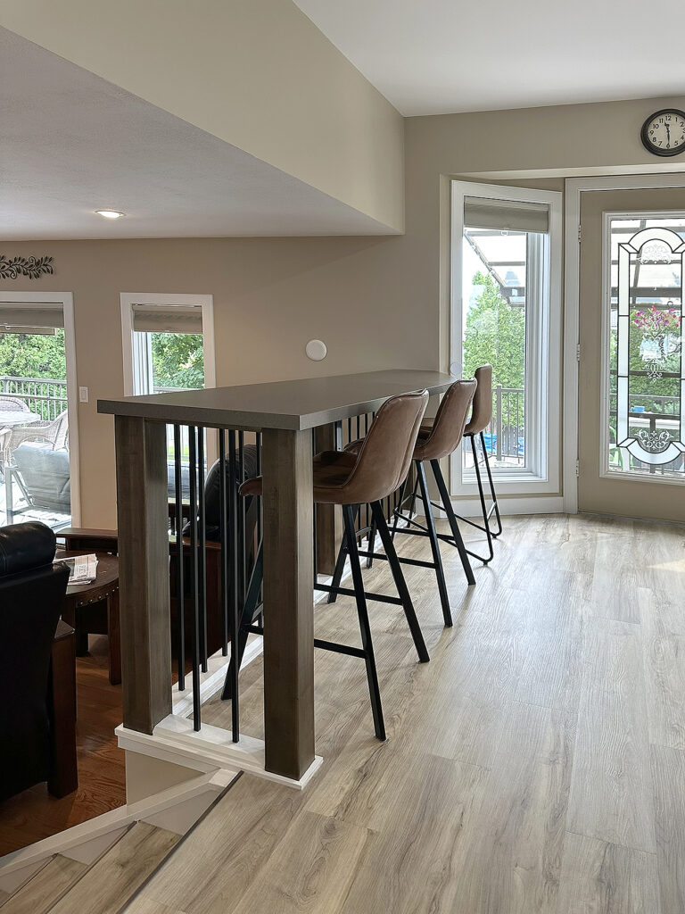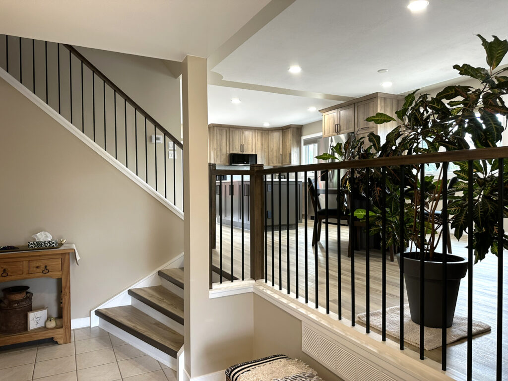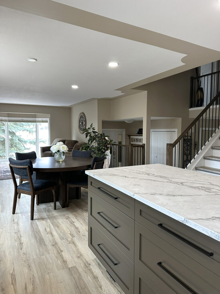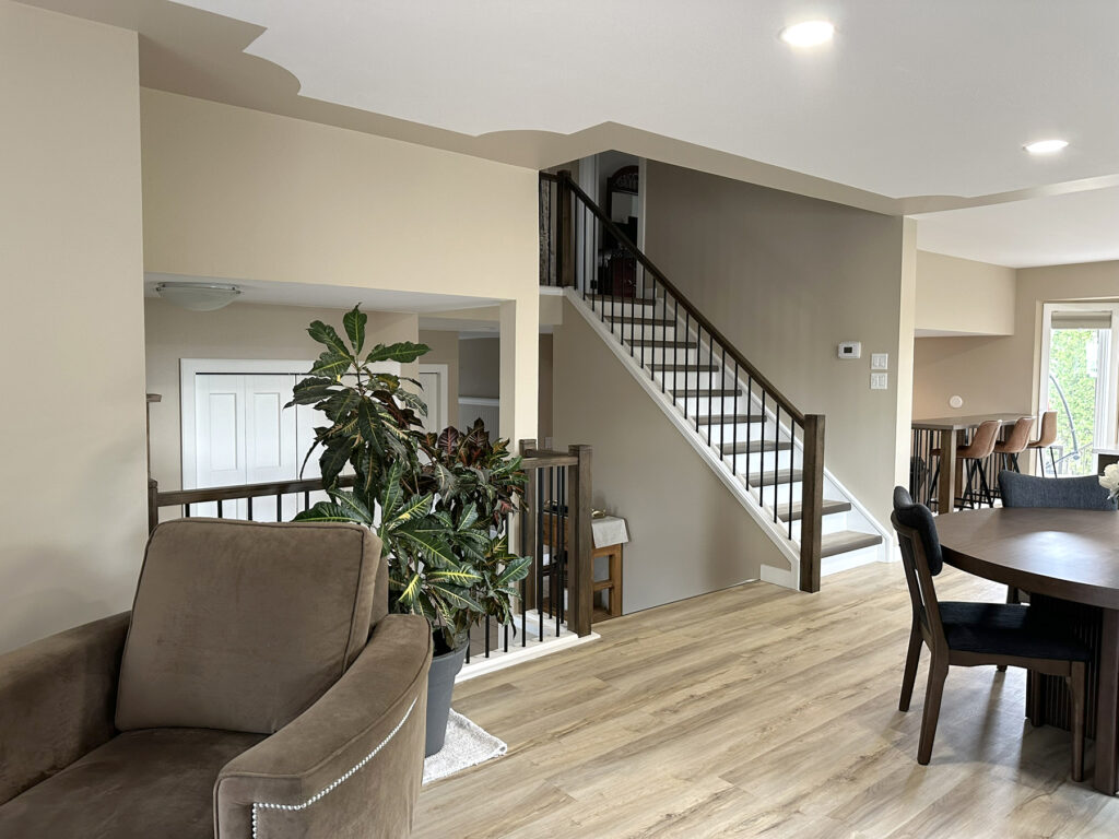 Main floor kitchen, living room and railings renovation. After an unfortunate dishwasher leak ruining the floor, the clients decided to go all-in on a full renovation with our team at TBC! We removed the wall between the dining area and the kitchen, updated all the railings, and installed new flooring throughout the main level which created an open concept beautiful updated new living space for this lovely couple. Check out the before & after photos to see the transformation!
