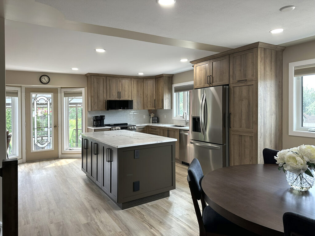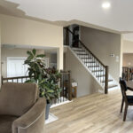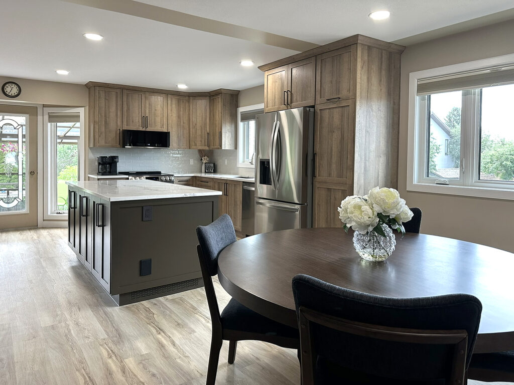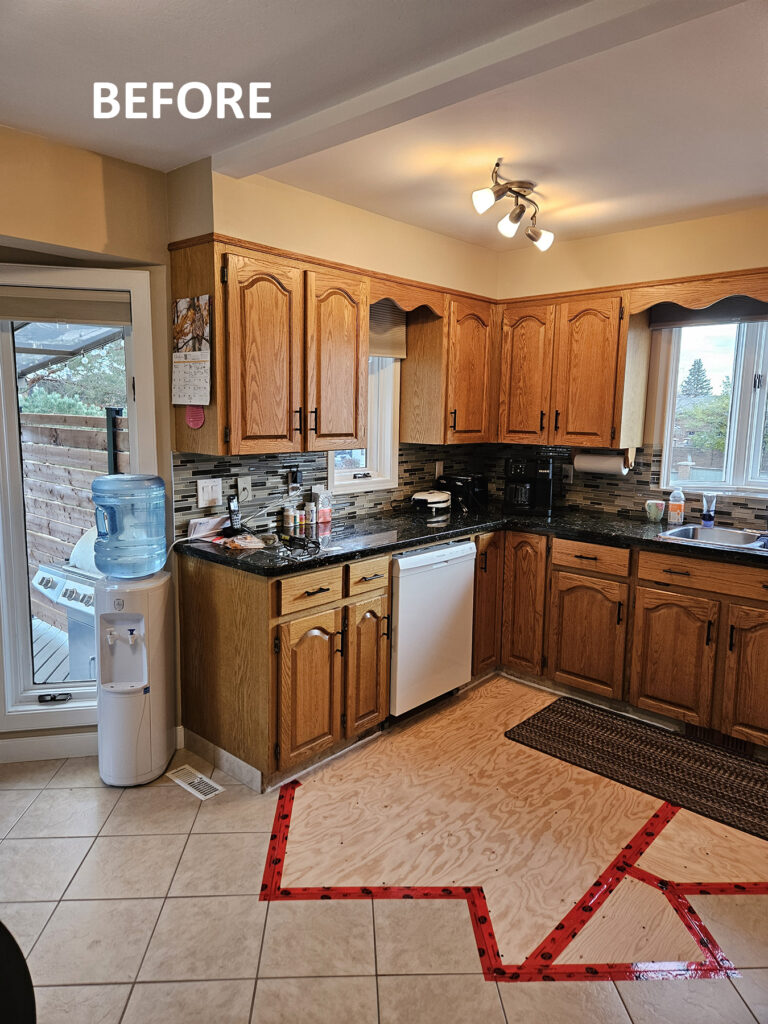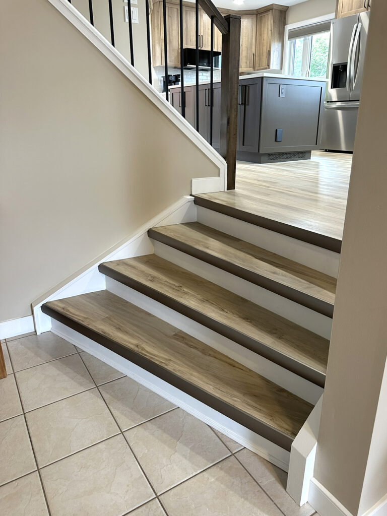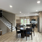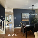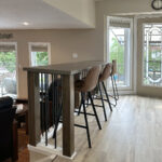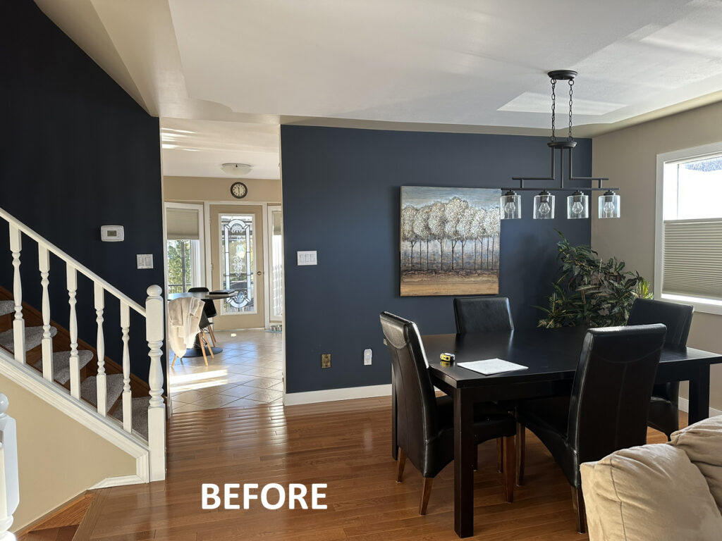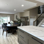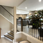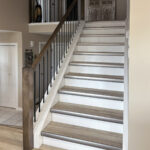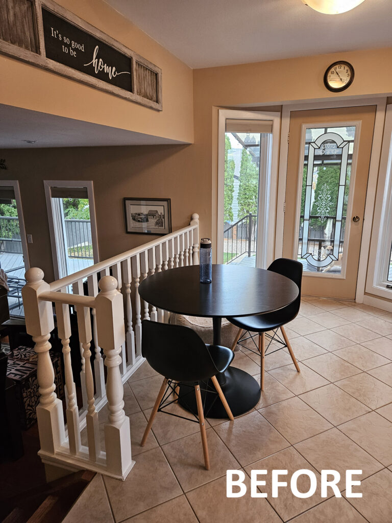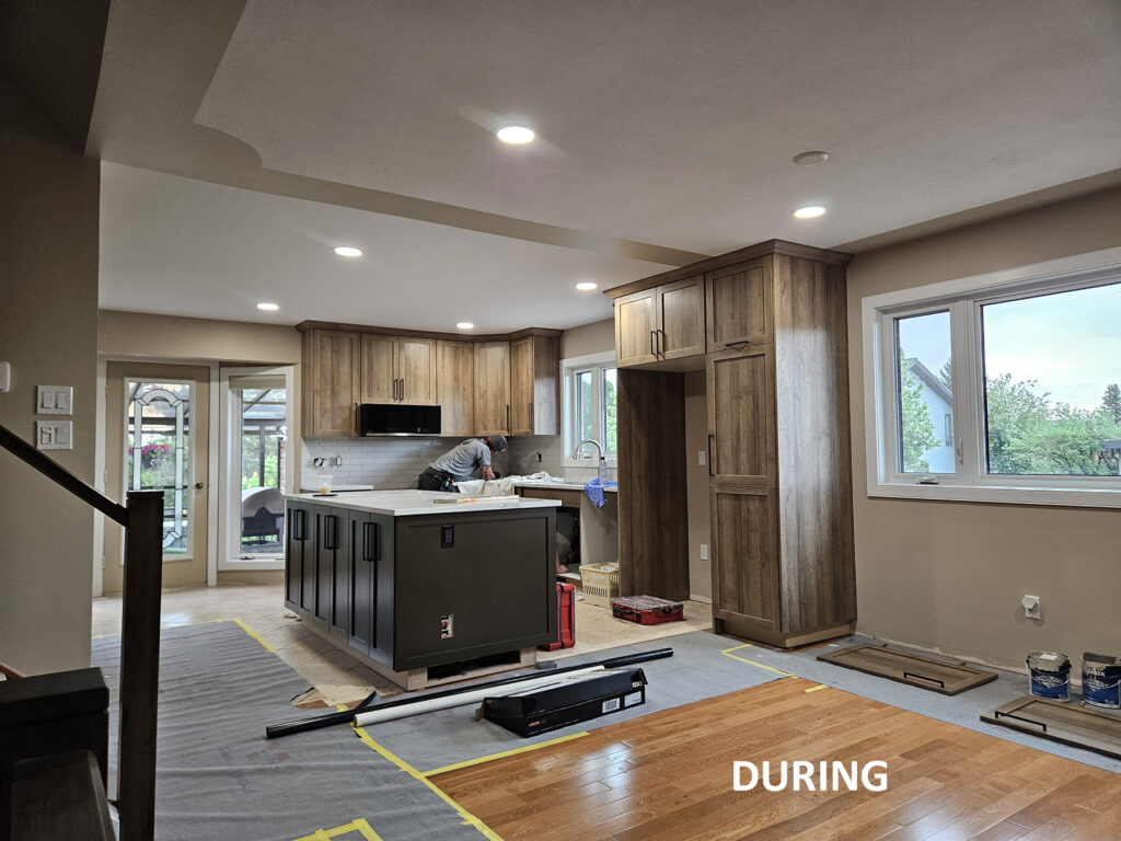 Main floor kitchen, living room and railings renovation. After an unfortunate dishwasher leak ruining the floor, the clients decided to go all-in on a full renovation with our team at TBC! We removed the wall between the dining area and the kitchen, updated all the railings, and installed new flooring throughout the main level which created an open concept beautiful updated new living space for this lovely couple. Check out the before & after photos to see the transformation!