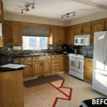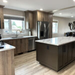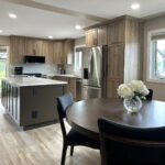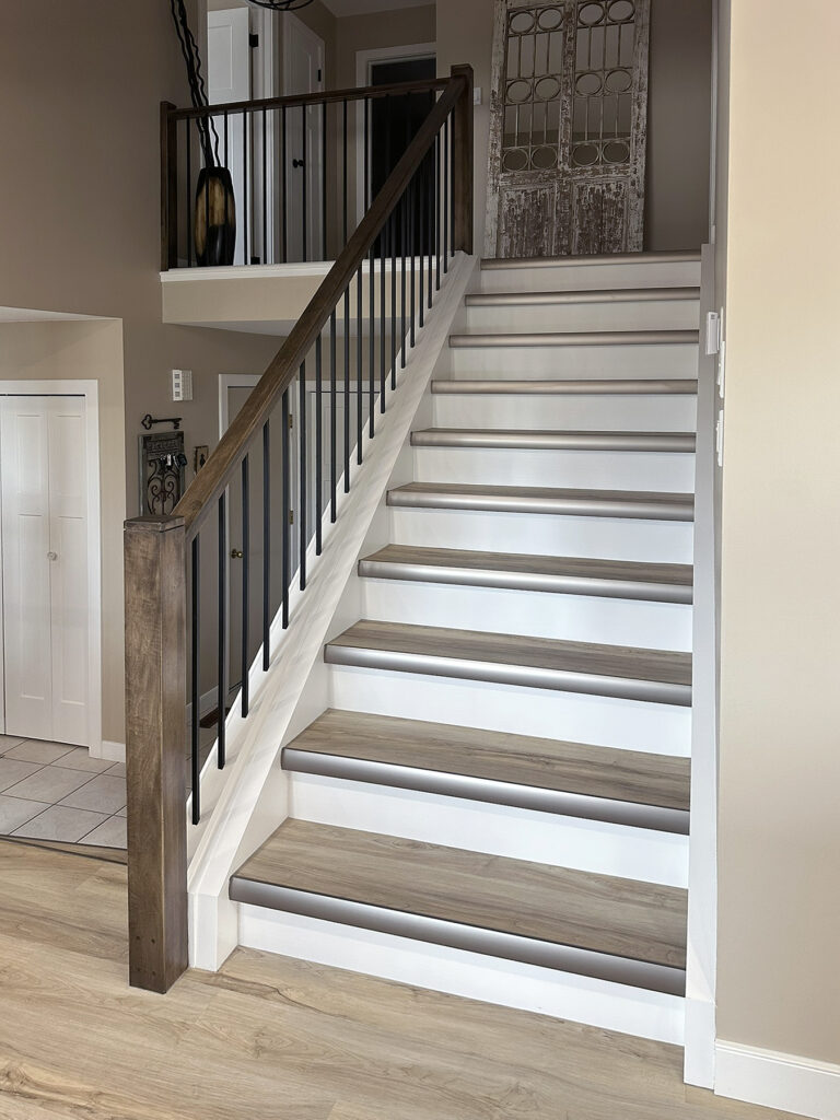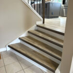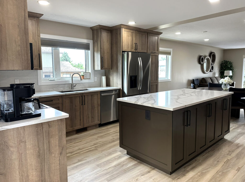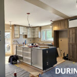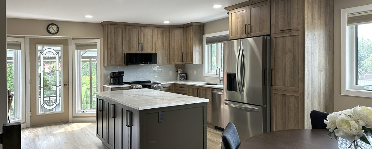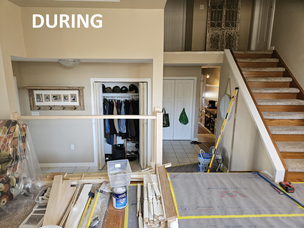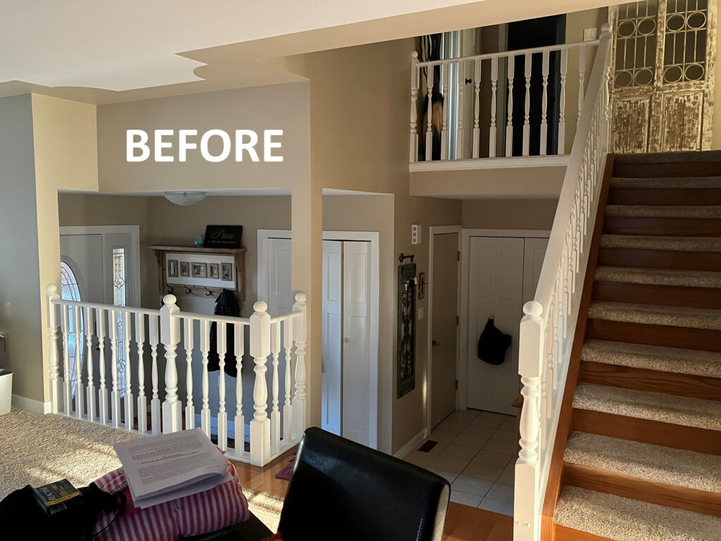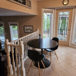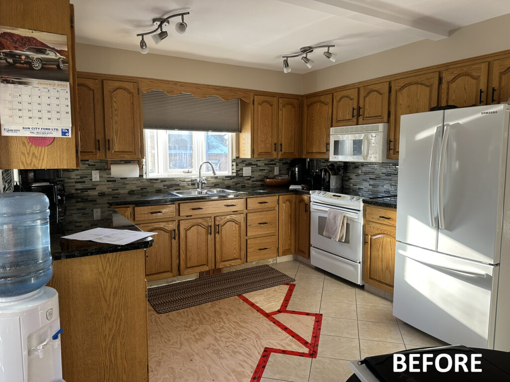 Main floor kitchen, living room and railings renovation. After an unfortunate dishwasher leak ruining the floor, the clients decided to go all-in on a full renovation with our team at TBC! We removed the wall between the dining area and the kitchen, updated all the railings, and installed new flooring throughout the main level which created an open concept beautiful updated new living space for this lovely couple. Check out the before & after photos to see the transformation!
