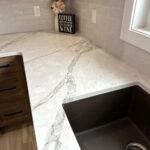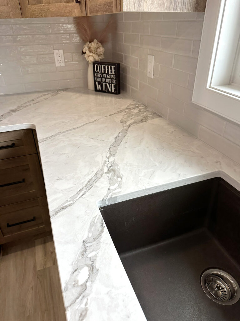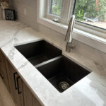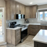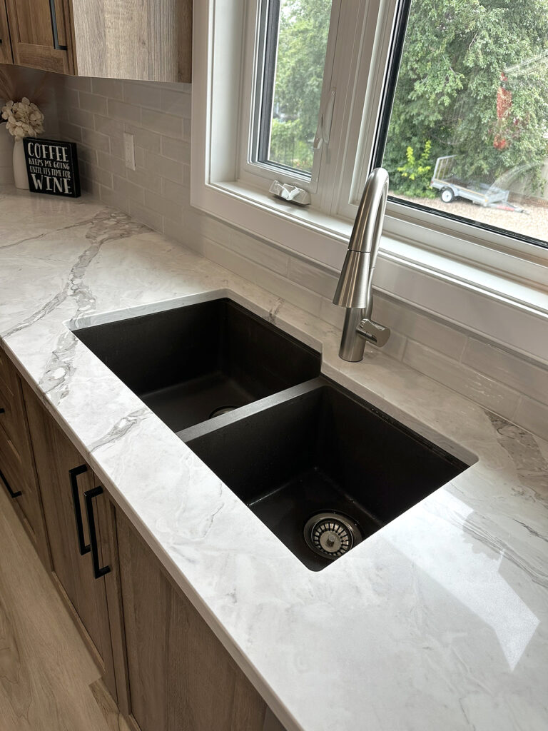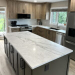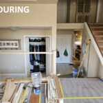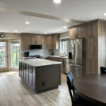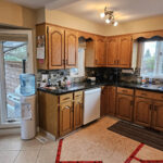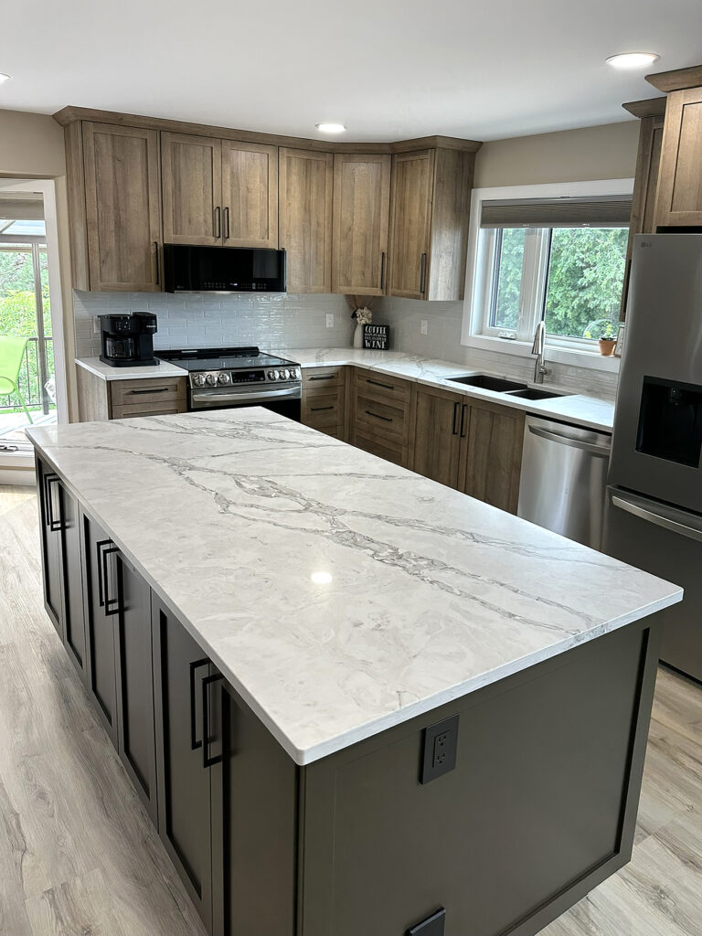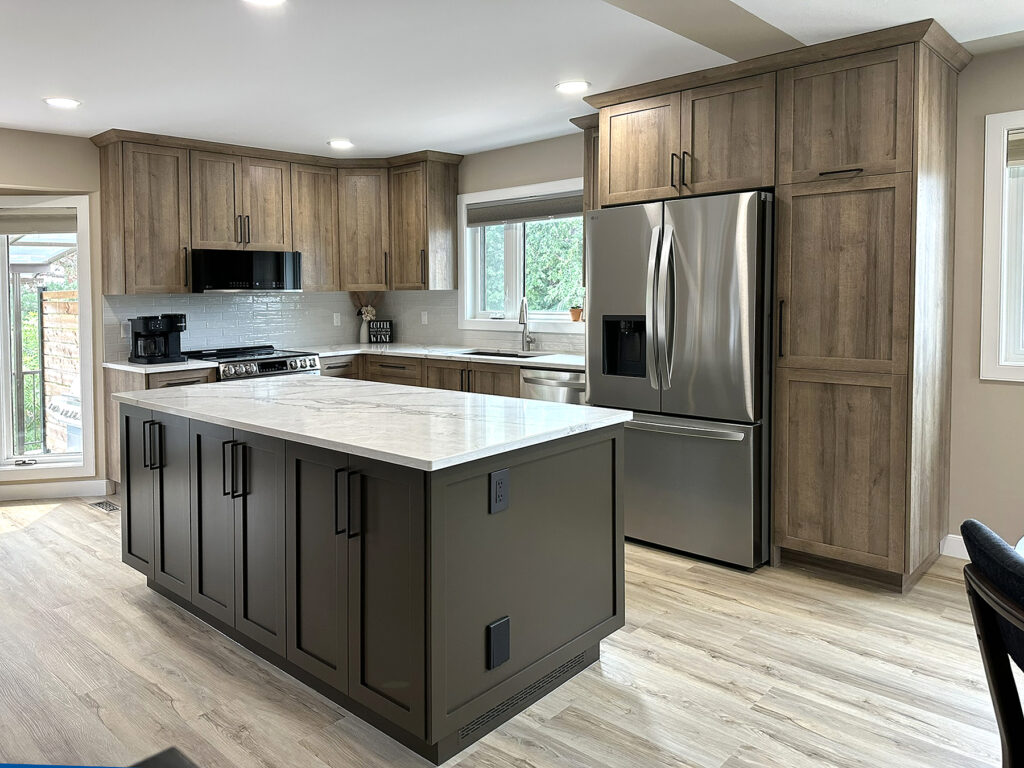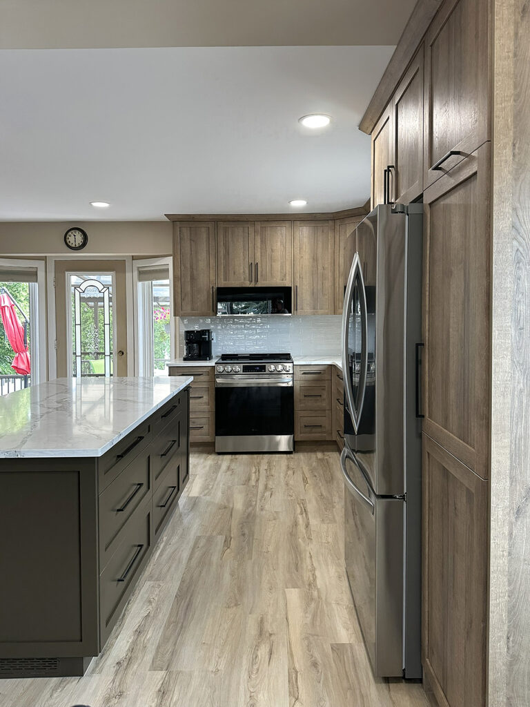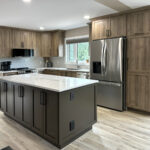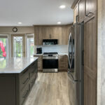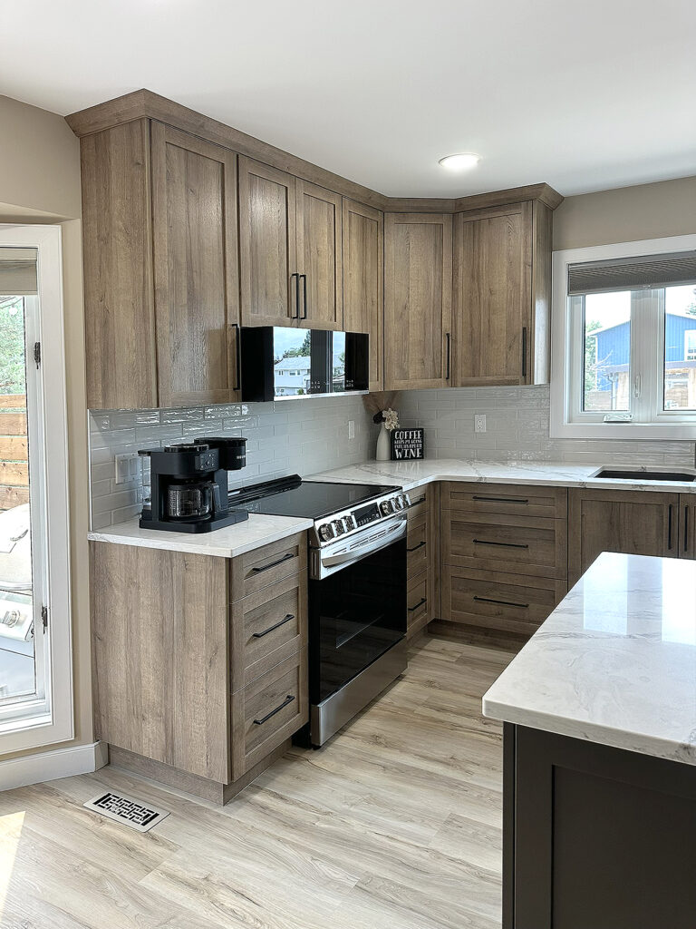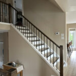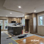 Main floor kitchen, living room and railings renovation. After an unfortunate dishwasher leak ruining the floor, the clients decided to go all-in on a full renovation with our team at TBC! We removed the wall between the dining area and the kitchen, updated all the railings, and installed new flooring throughout the main level which created an open concept beautiful updated new living space for this lovely couple. Check out the before & after photos to see the transformation!